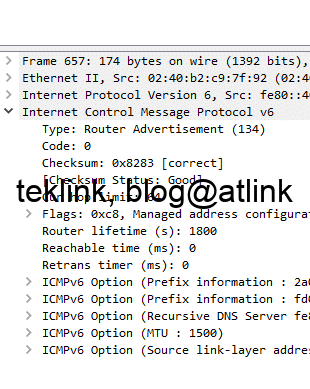 In Wireshark, we check that Router Advertisements are being sent periodically by the router (identified by its unique MAC) to the multicast address ff02::1 (to all hosts). These messages contains information about prefix information (global unique routable) and even the DNS to use.