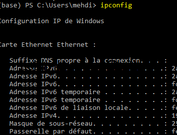 The CLI output of the command ipconfig, we check the active interface is configured by 6 IPv6 in addition to one IPv4 interface. You may notice also the no subnetwork is associated with the IPv6 addresses… the information is already included in the structure of the IPv6 address. To get details about this structure, please refer to this article: IPv6 Wikipedia.