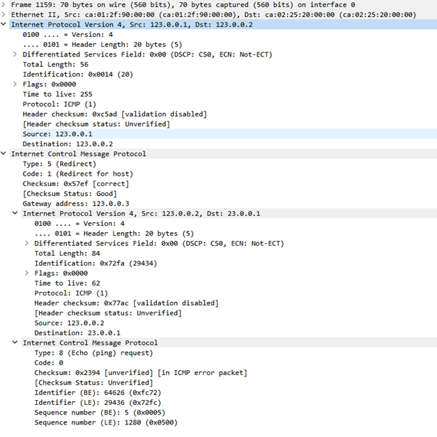 in the wireshak output we check that R2 receives an IP packet from R1 sourced from 123.0.0.1 and destined to 123.0.0.2. the ICMP data is embedded into this IP packet and indicated an ICMP type message of 5 which is redirect with code 1, redirect for host.